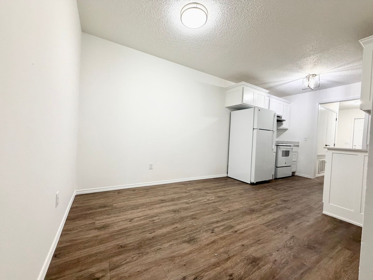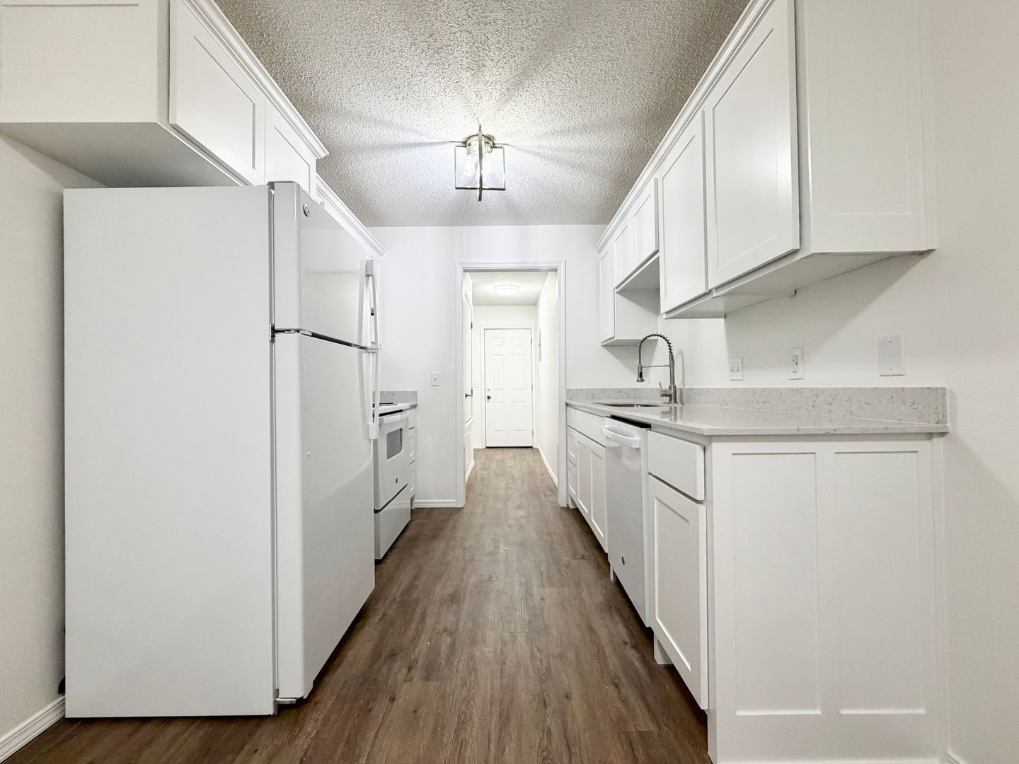 JUST REMODELED!!!! All new cabinets, flooring, paint and appliances. Great Location with this 2 bed 1 1/2 bath duplex in Johnson just minutes from I-49. Wood style flooring throughout. Large living room opens into kitchen. Kitchen includes refrigerator, glass top range and dishwasher. Back yard is fenced. washer/dryer hookups and 1 car garage.