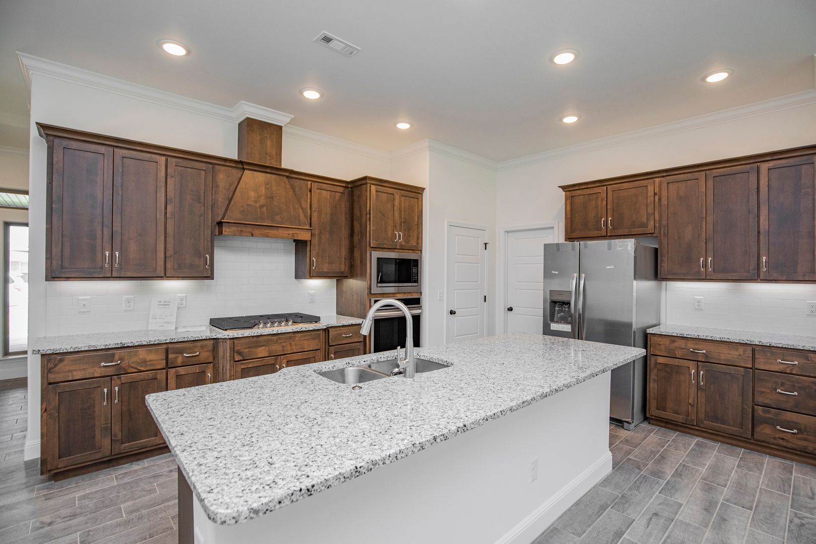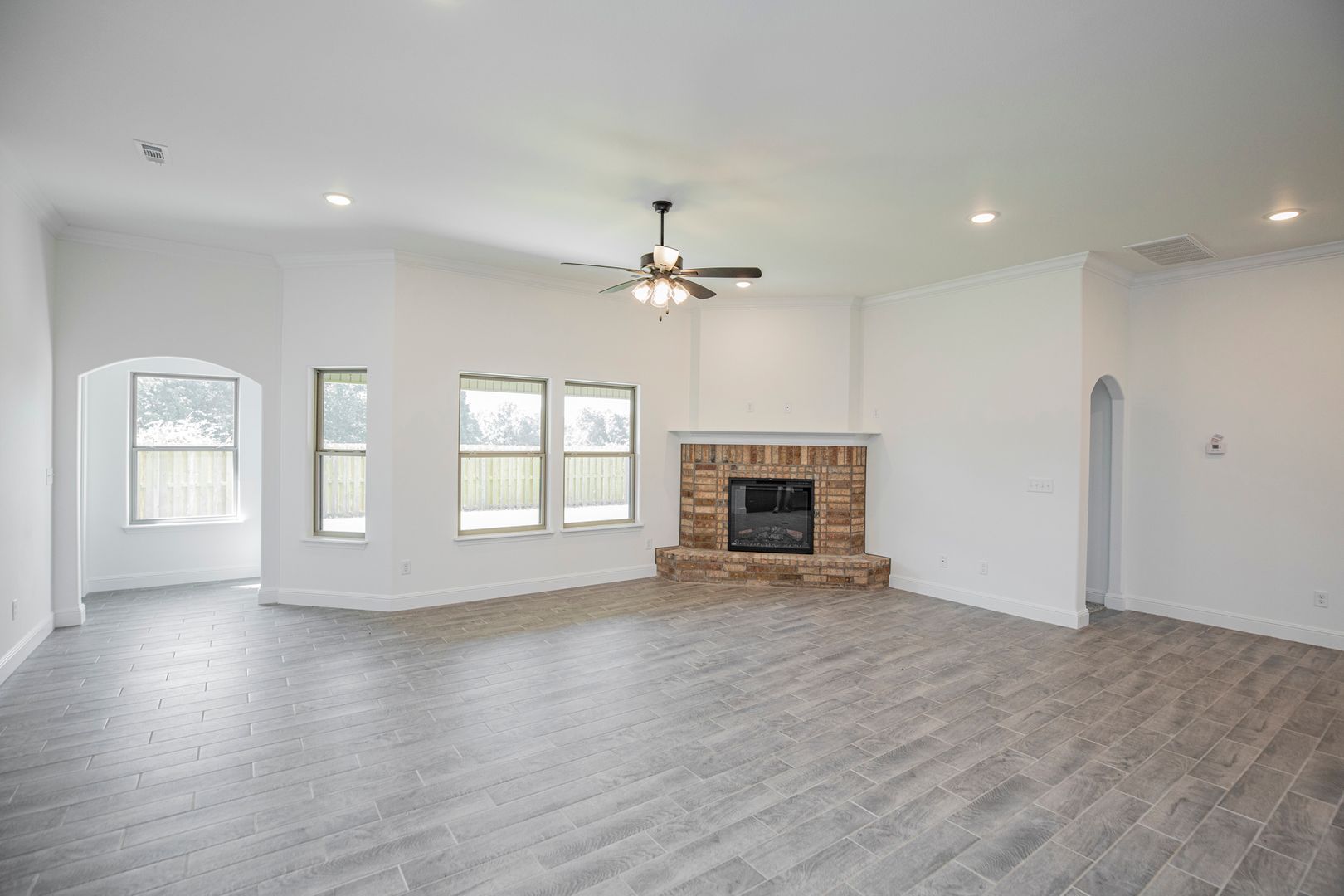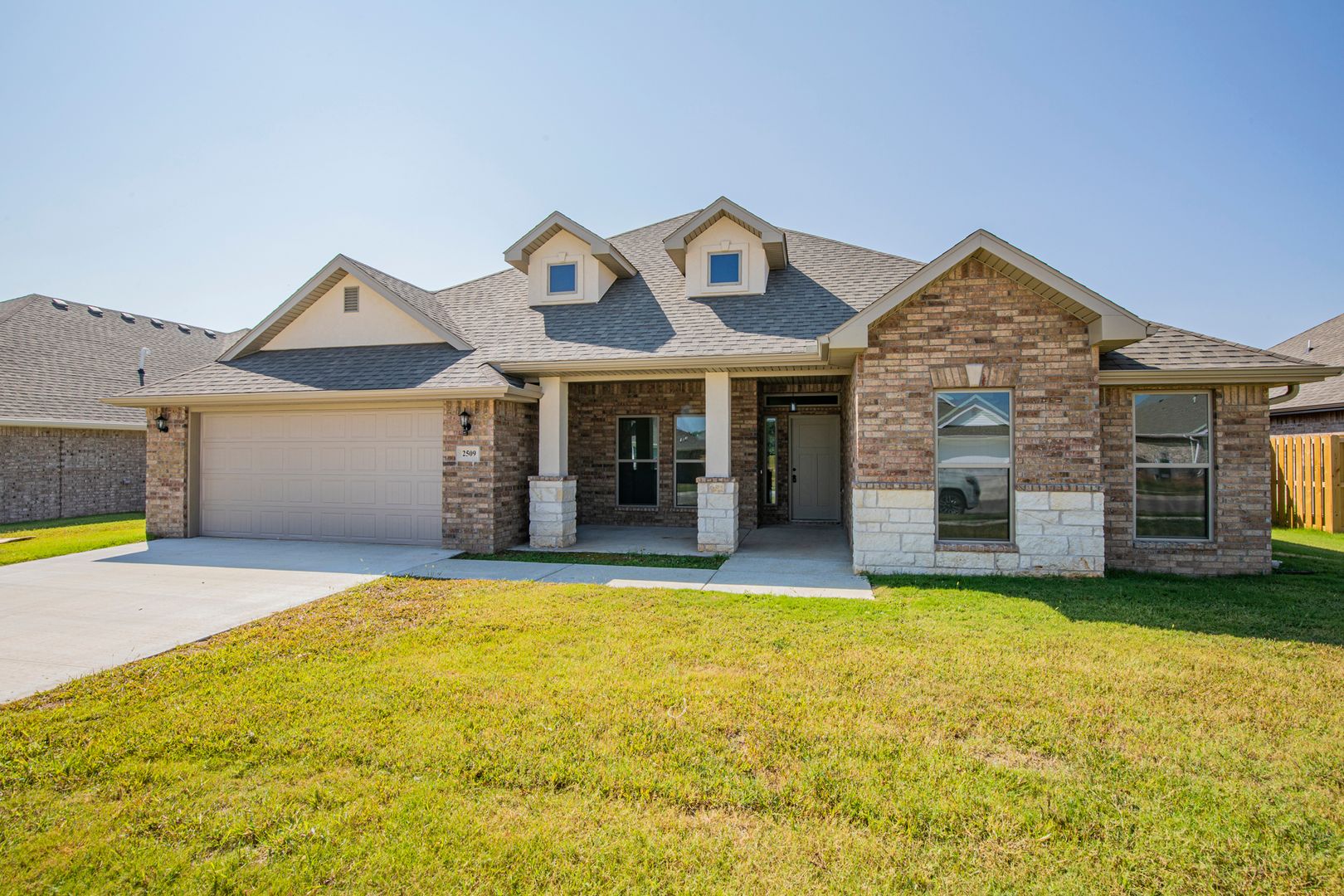 Beautiful Construction!!! Open floor plan. Main living area has wood style tile flooring and crown molding, bedrooms have carpet. Kitchen features granite counters, built in microwave and range, gas cook top, refrigerator and large pantry. Living room features gas fireplace. Primary suite has double vanities, separate tub, granite shower and large walk in closet. Large fenced back yard with covered patio area.