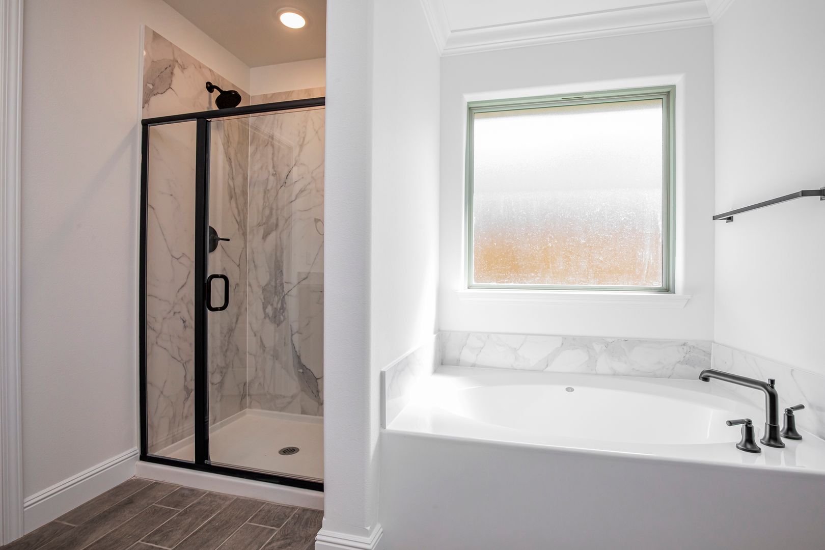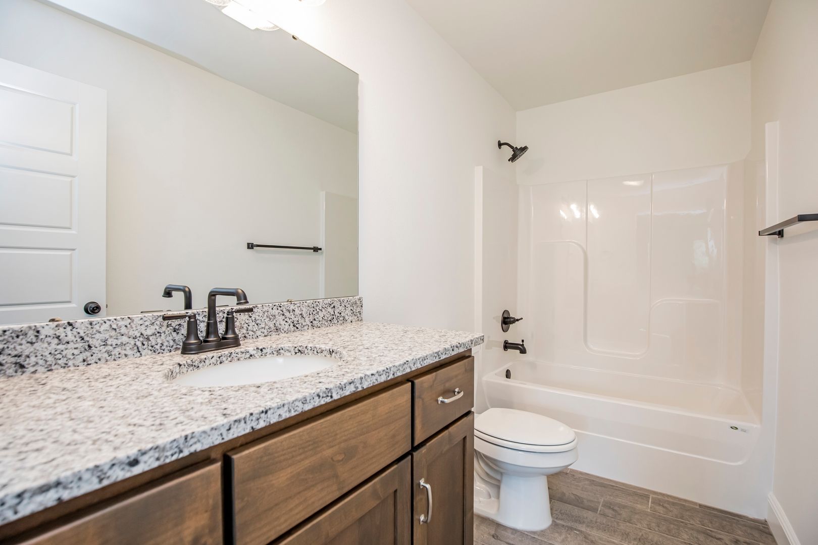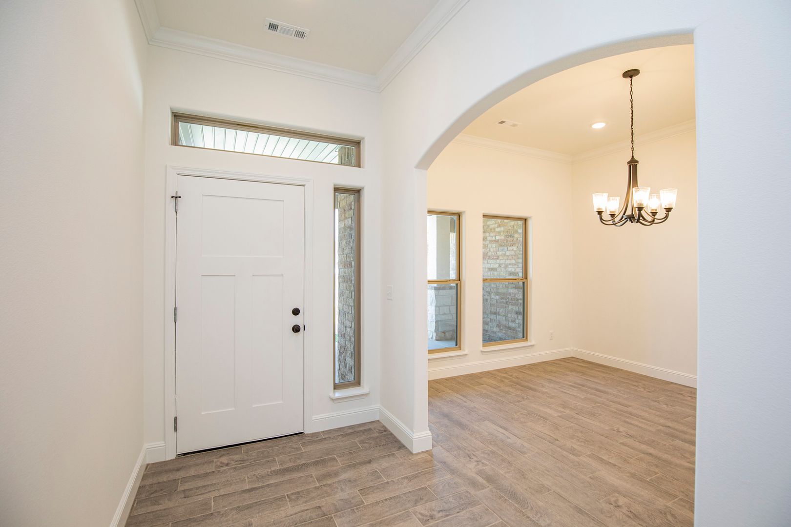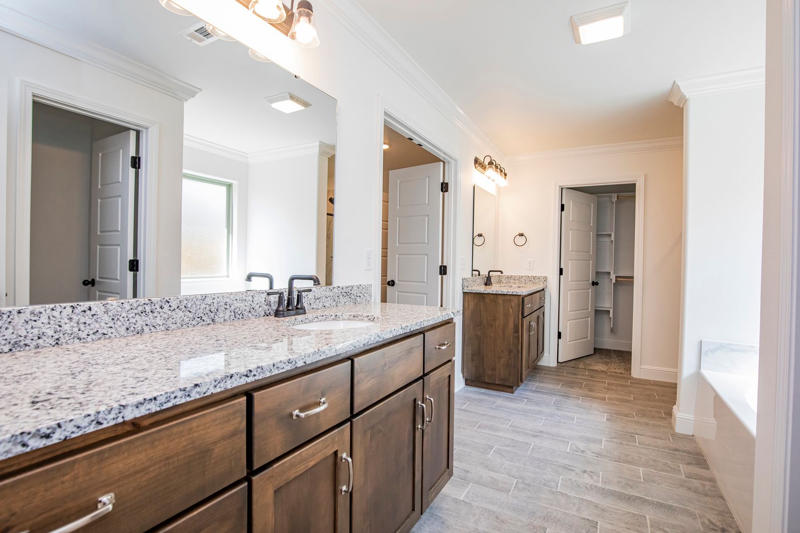 Beautiful Construction!!! Open floor plan. Main living area has wood style tile flooring and crown molding, bedrooms have carpet. Kitchen features granite counters, built in microwave and range, gas cook top, refrigerator and large pantry. Living room features gas fireplace. Primary suite has double vanities, separate tub, granite shower and large walk in closet. Large fenced back yard with covered patio area.