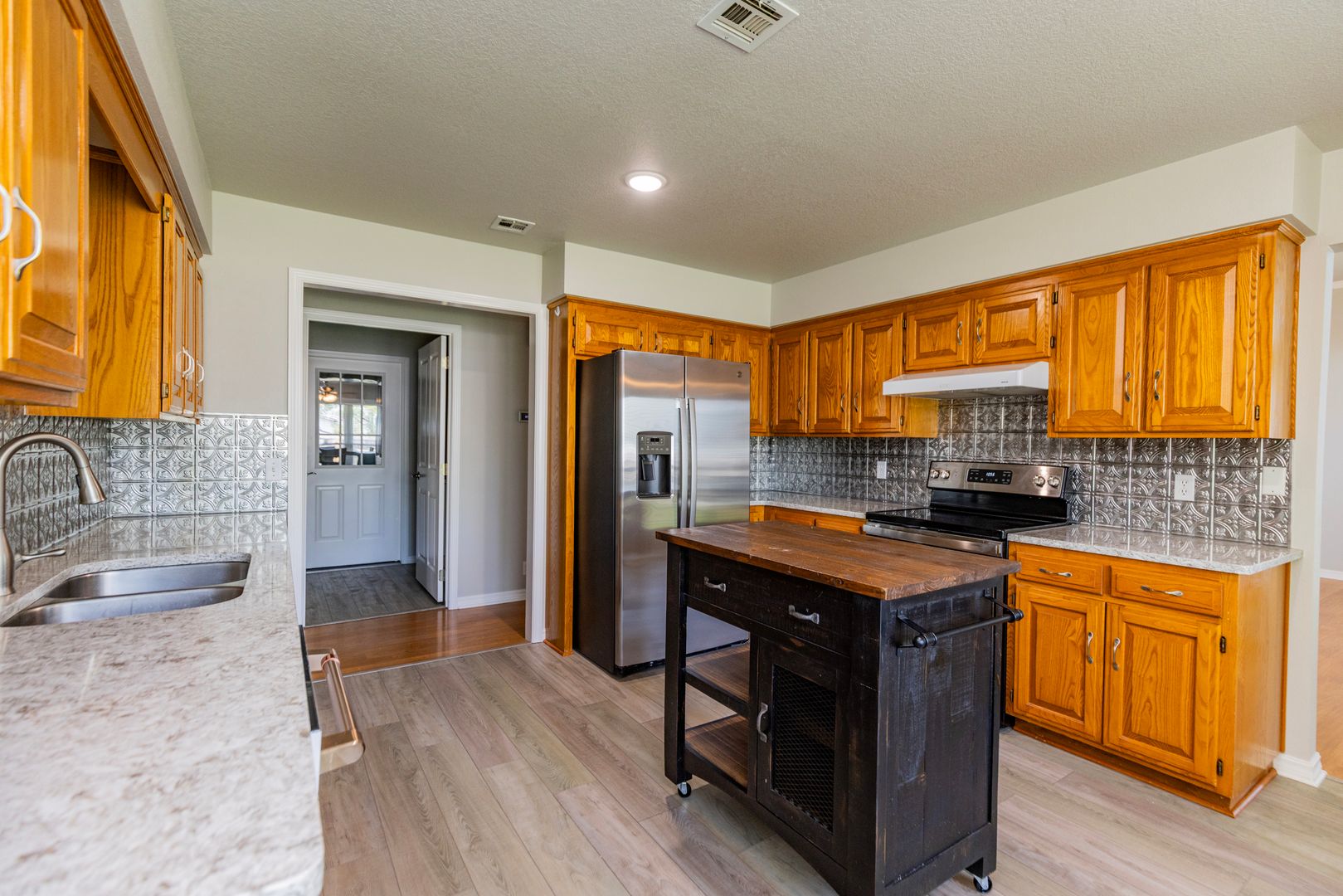 Beautifully maintained home in Rogers just minutes Mt. Hebron park, school, shopping and dining. This 3 bedroom 2 bath home with split floor plan has a large kitchen with eat in area, quartz counter, wood style flooring and includes refrigerator, additionally there is a formal dining room, large living room with wood flooring and wood burning fire place. Primary suite has oversized walk in closet, bath with double sinks and separate tub and shower Large covered patio off of primary bedroom. 3 car garage. Owner will maintain the lawn and flower beds.