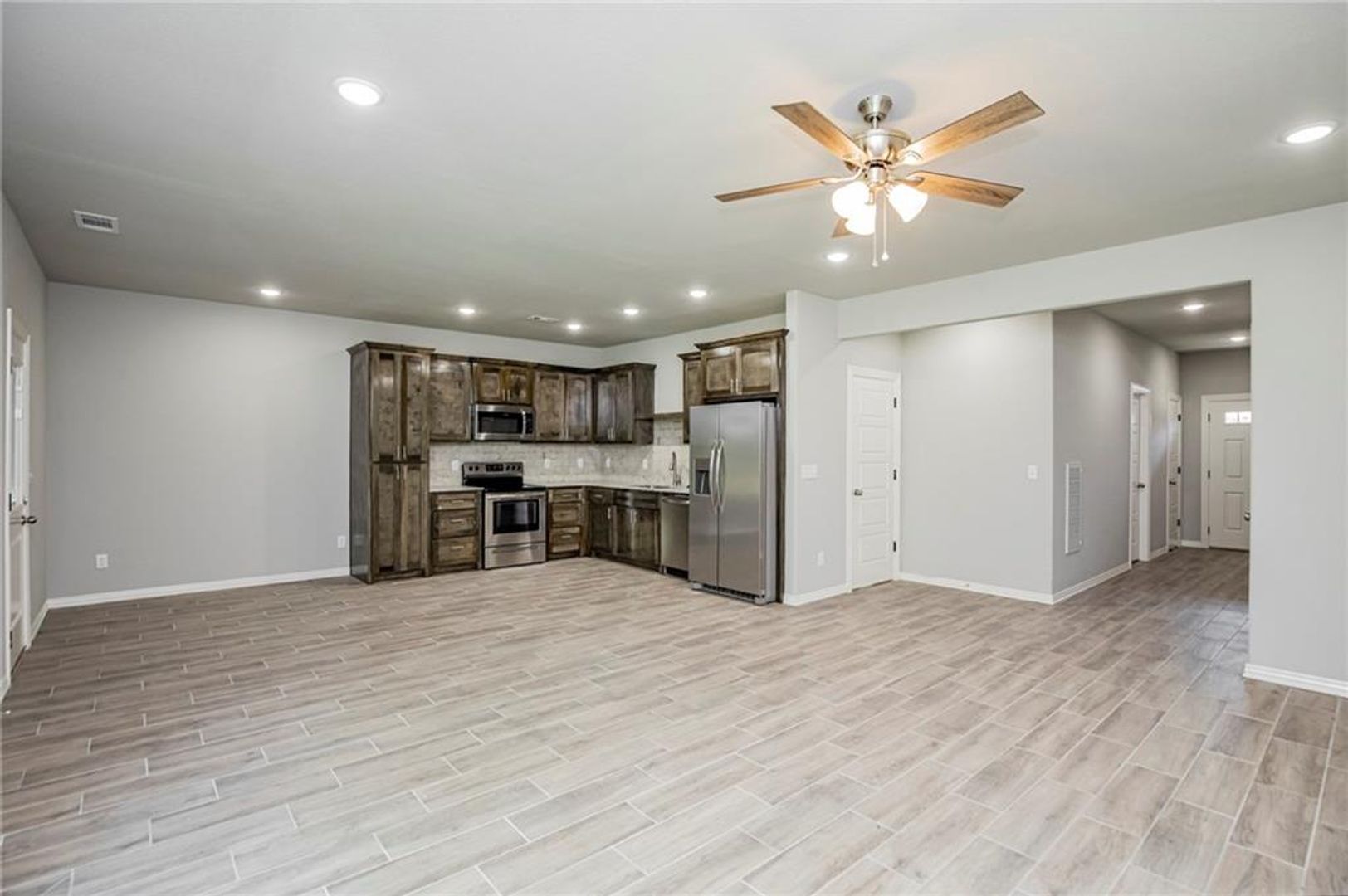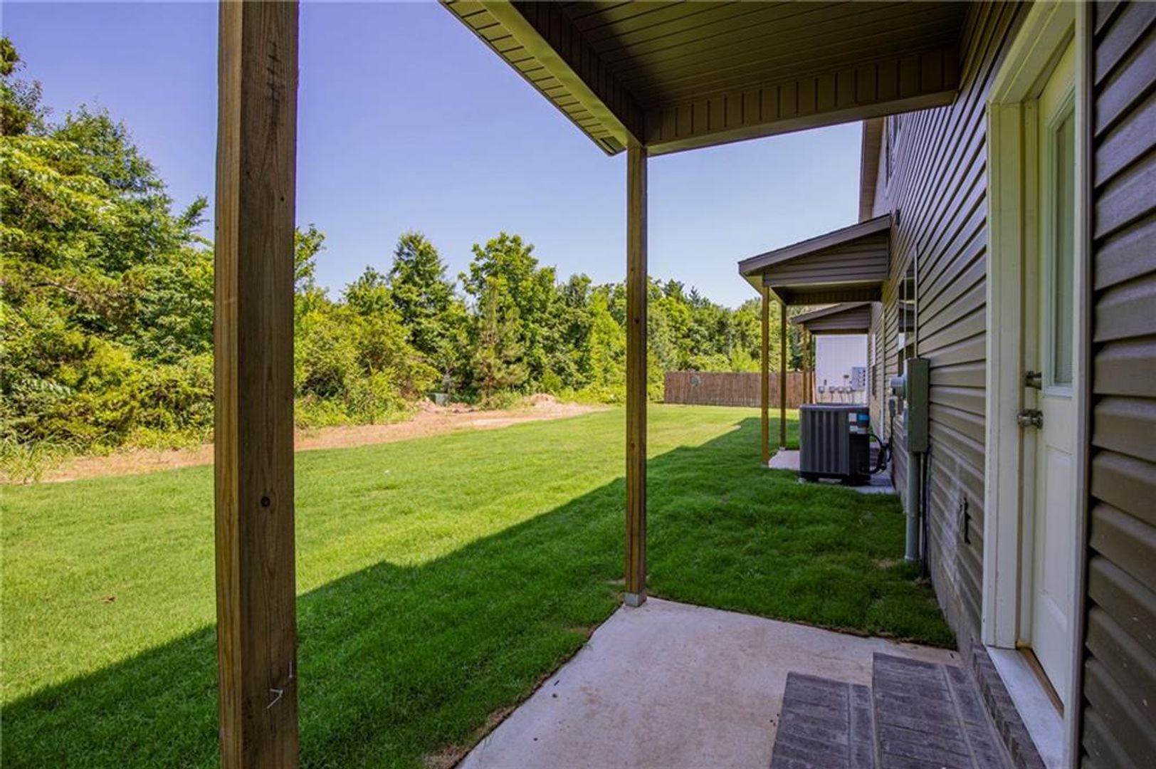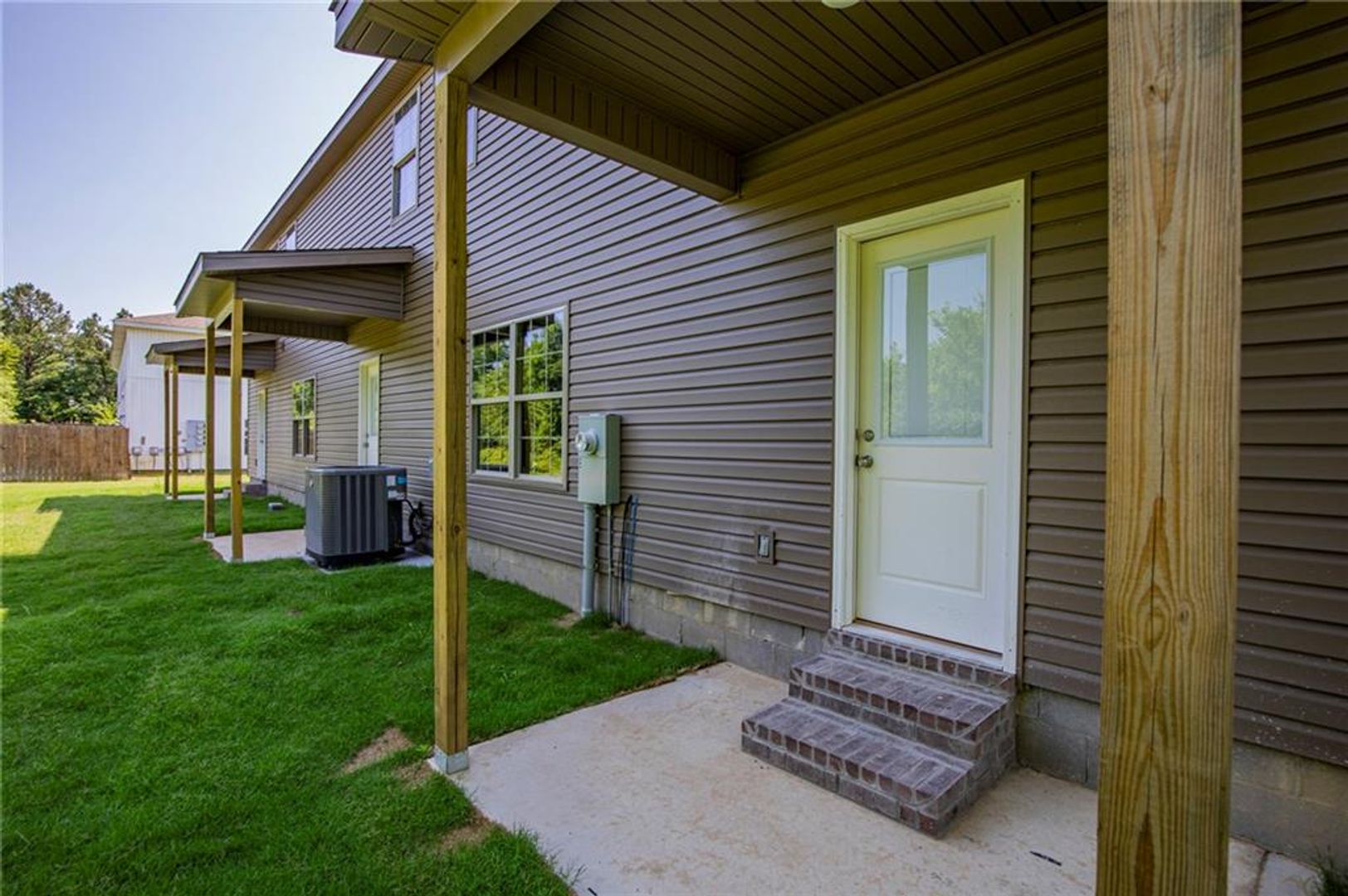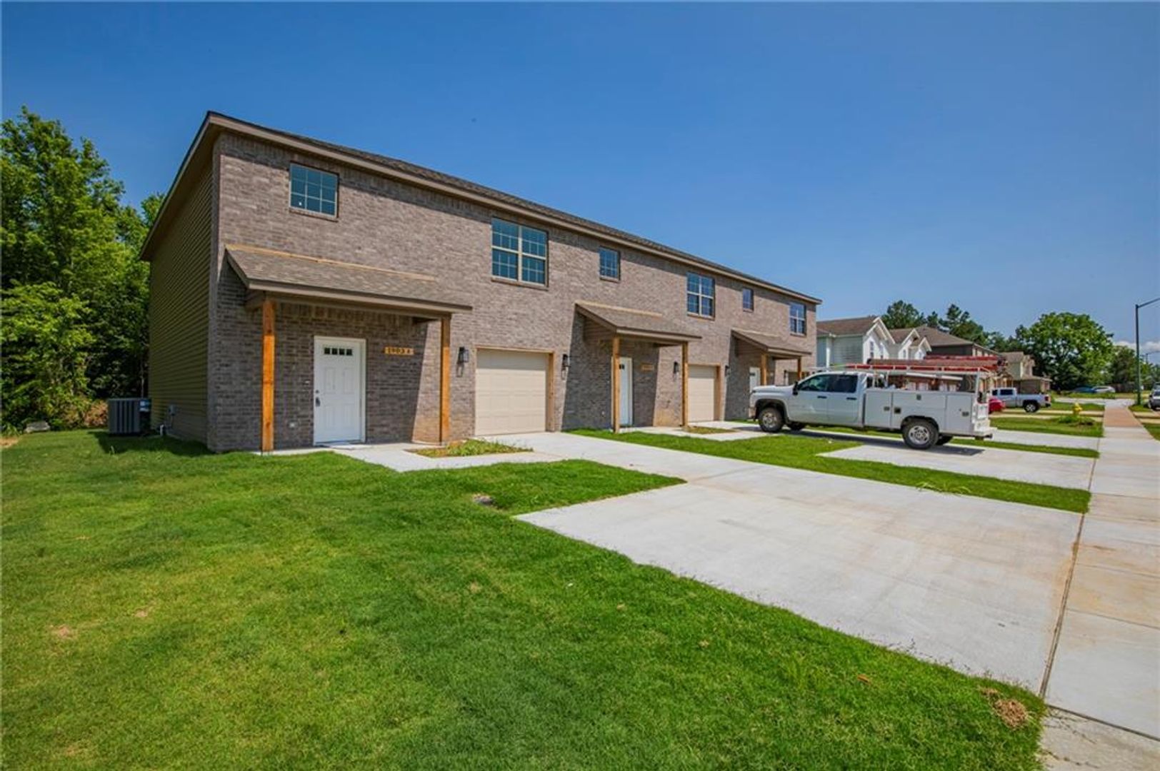 New Construction Tri-Plex in Siloam Springs. 3 bedrooms 2.5 baths. Main living area has vinyl plank wood style flooring through main living area, carpet in bedrooms. Kitchen features granite counters and stainless appliances, includes refrigerator, over range microwave and pantry. 1/2 bath on main level. 3 bedroom and 2 full baths upstairs. Also included washer and dryer. Fenced yard.